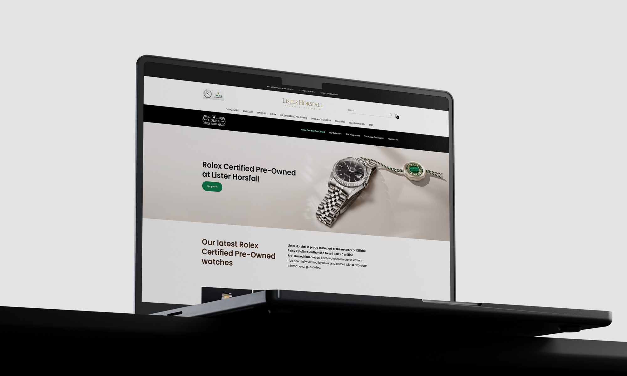 That meant overhauling ecommerce and the wider digital presence. Leading creative direction for campaigns and content. Rolling out the Rolex bespoke platform - a microsite built to Rolex's precise design standards while fully integrated with Lister Horsfall's own internal integrations. Then doing it again for Rolex Certified Pre-Owned, launching a new arm of the business.